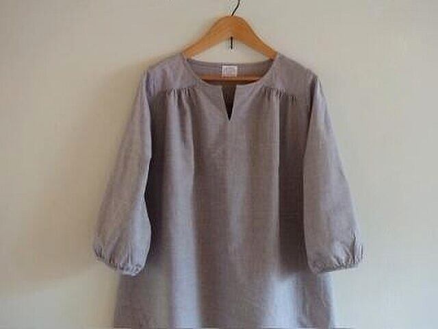 フロント高めのヨーク左右にギャザー、バッグヨークにもギャザーを入れたデザイン。