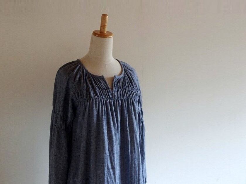 ゴムシャーリングをしたギャザーがポイントのチュニックワンピース。