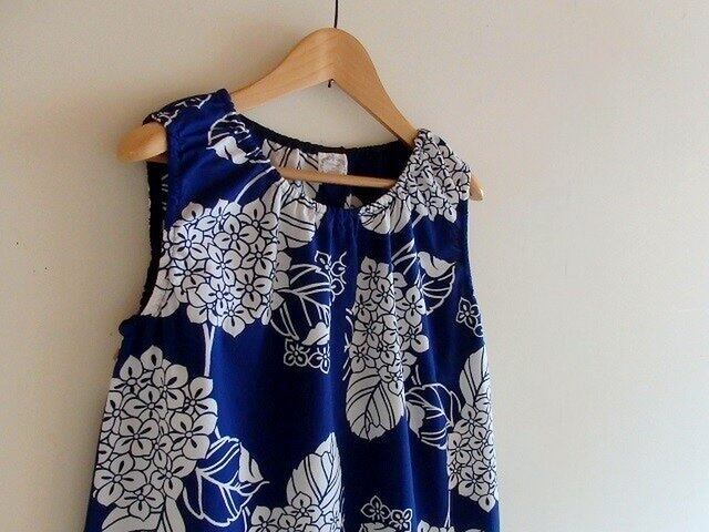 青地に紫陽花柄が爽やかな浴衣地のワンピースです。